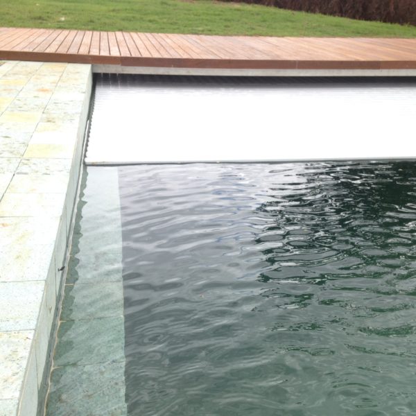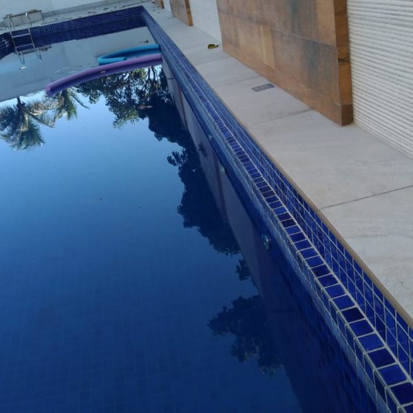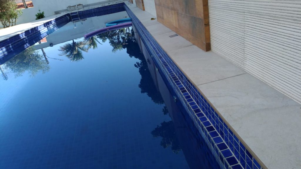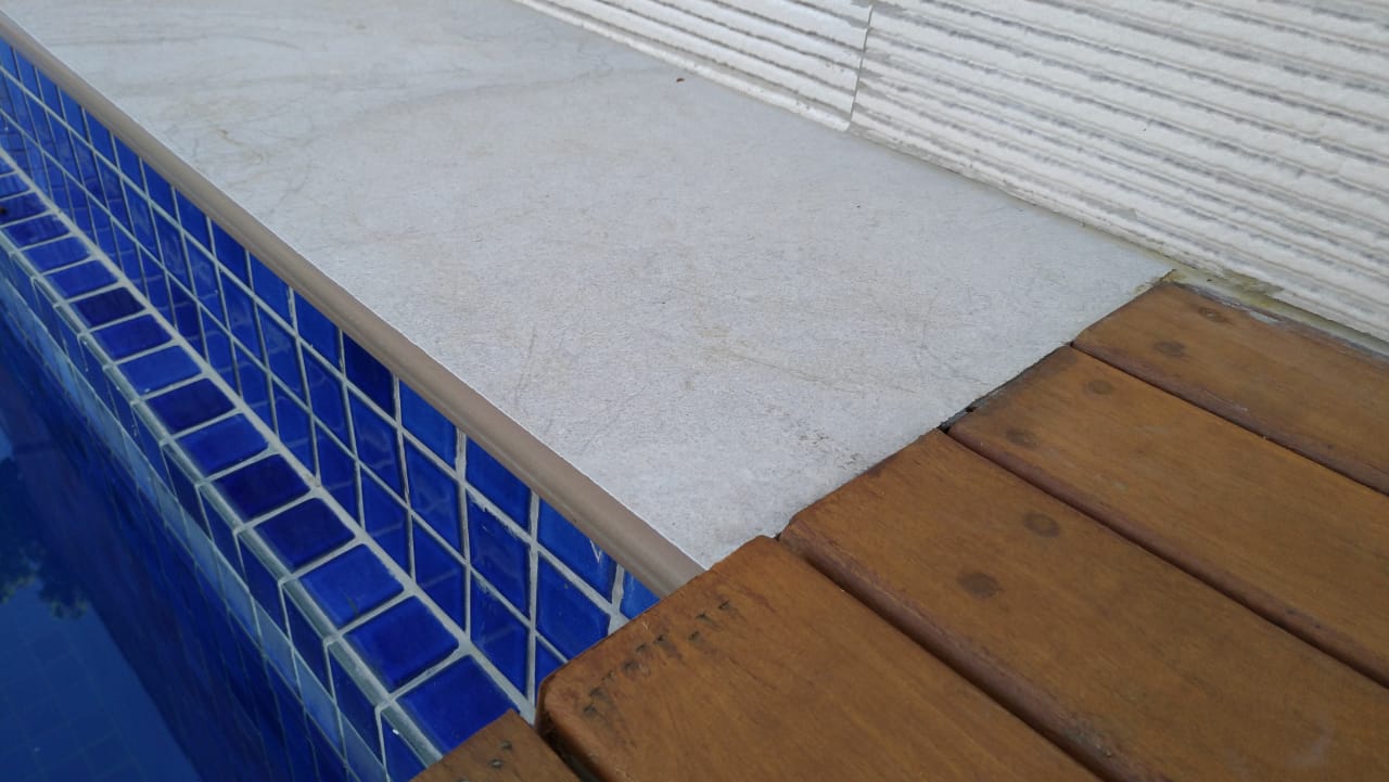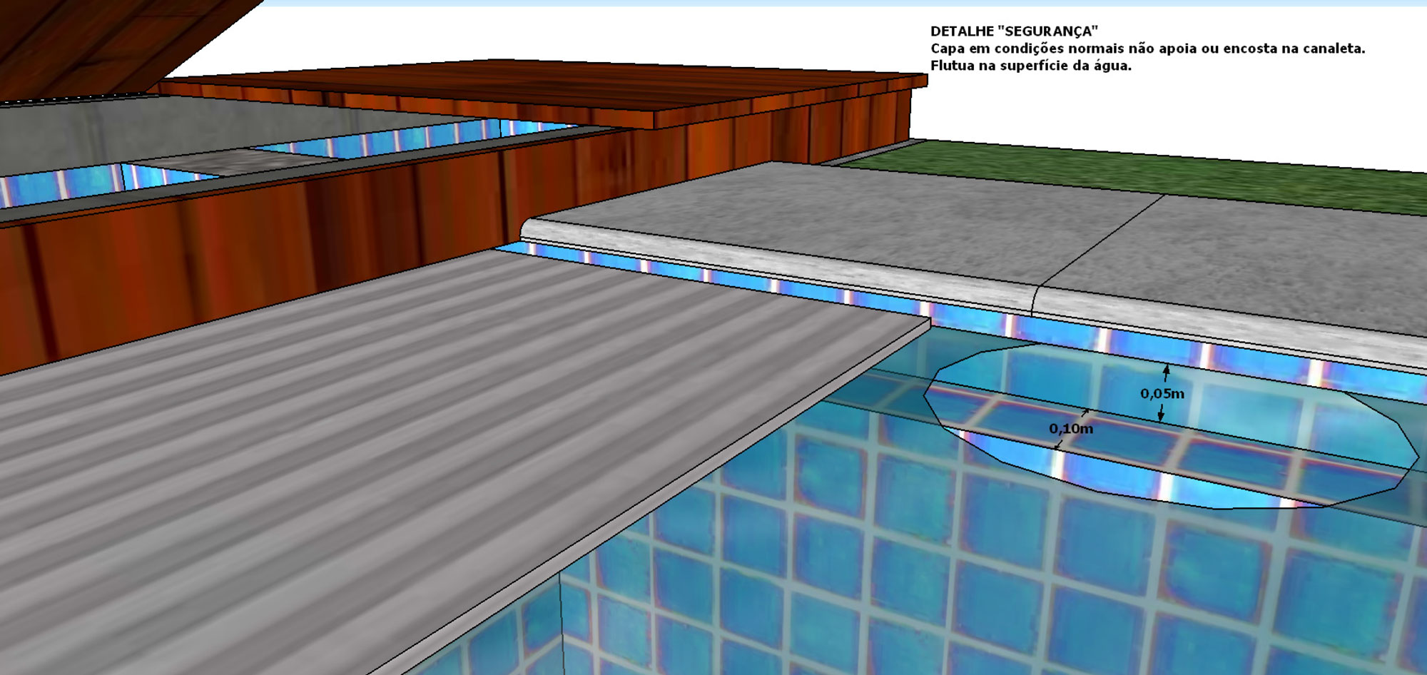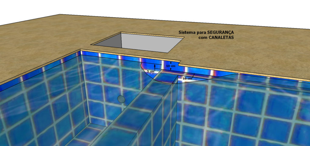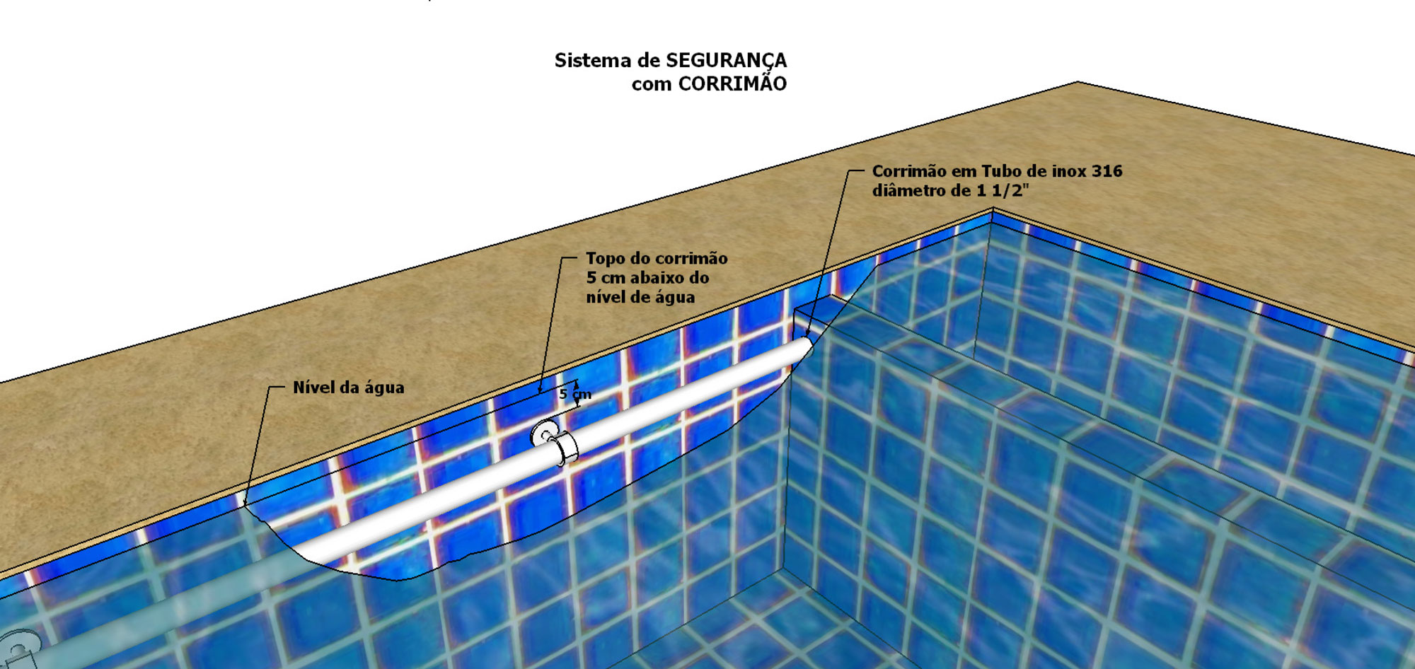 A CANALETA normalmente é prevista em piscinas em projeto, obra ou reforma, pois a mesma deverá ser executada na alvenaria da piscina. E o CORRIMÃO é uma alternativa para piscinas prontas, onde instalamos barras de inox abaixo do nível da piscina.