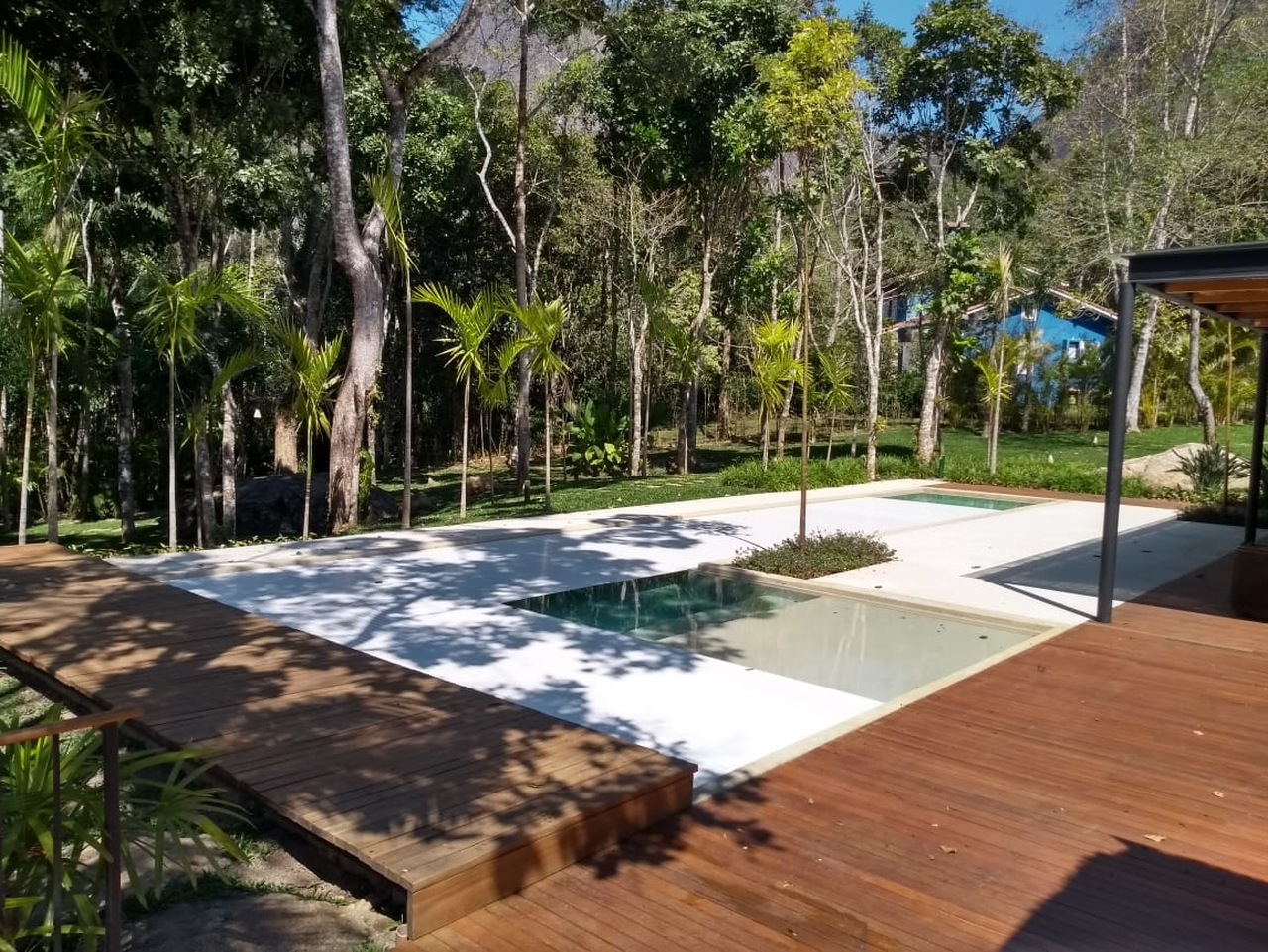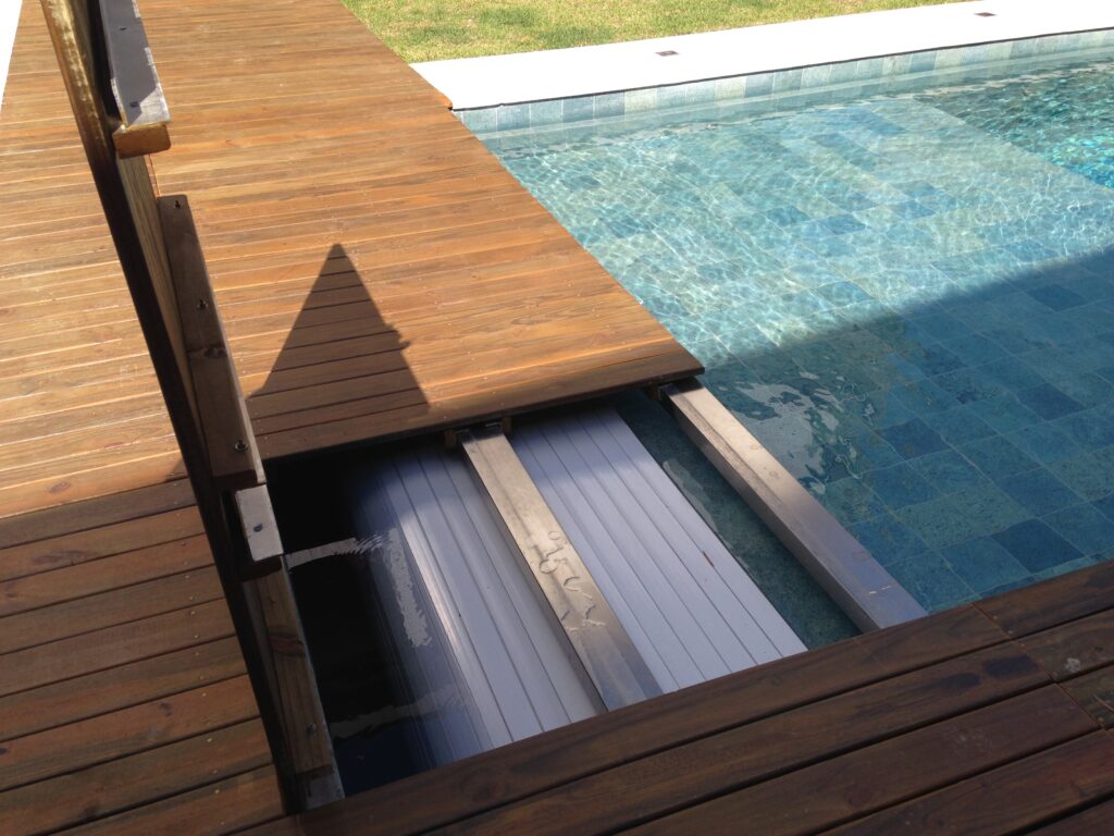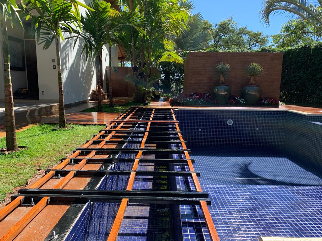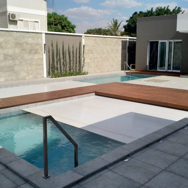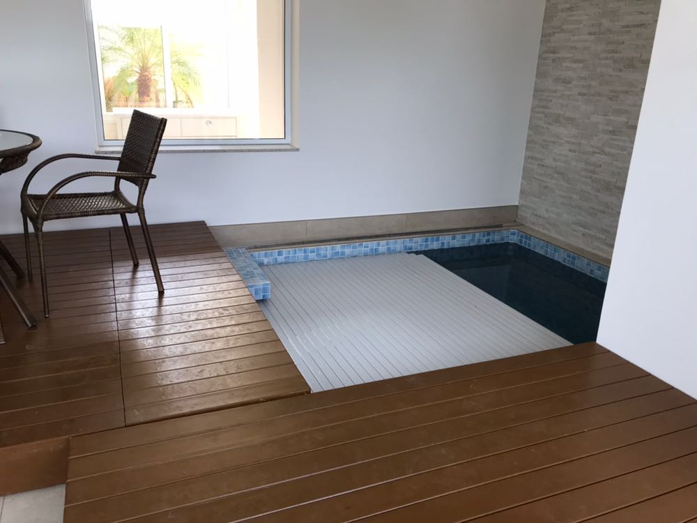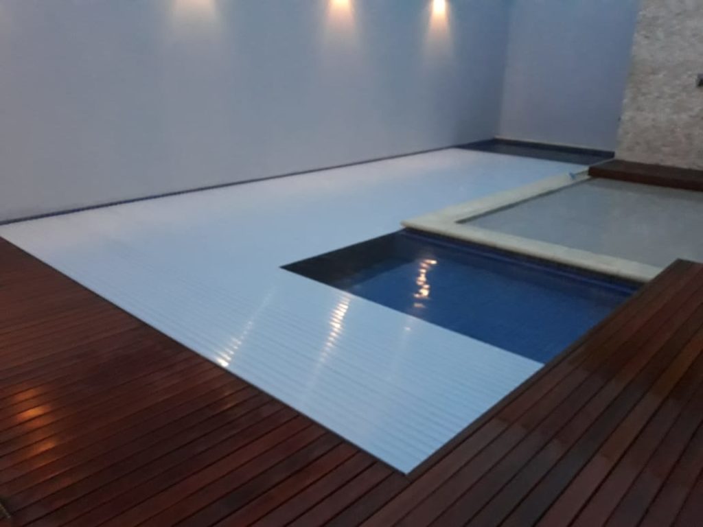 O deck de madeira é a alternativa mais recomendada para ser instalada sobre a caixa da capa e motor, pois exige uma estrutura metálica mais simples a ser executada devido ao peso da madeira, sugestão (Viga I ou Metalon). E também, o deck de madeira é um material mais leve para ser manuseado quando necessário acessar o compartimento da capa.