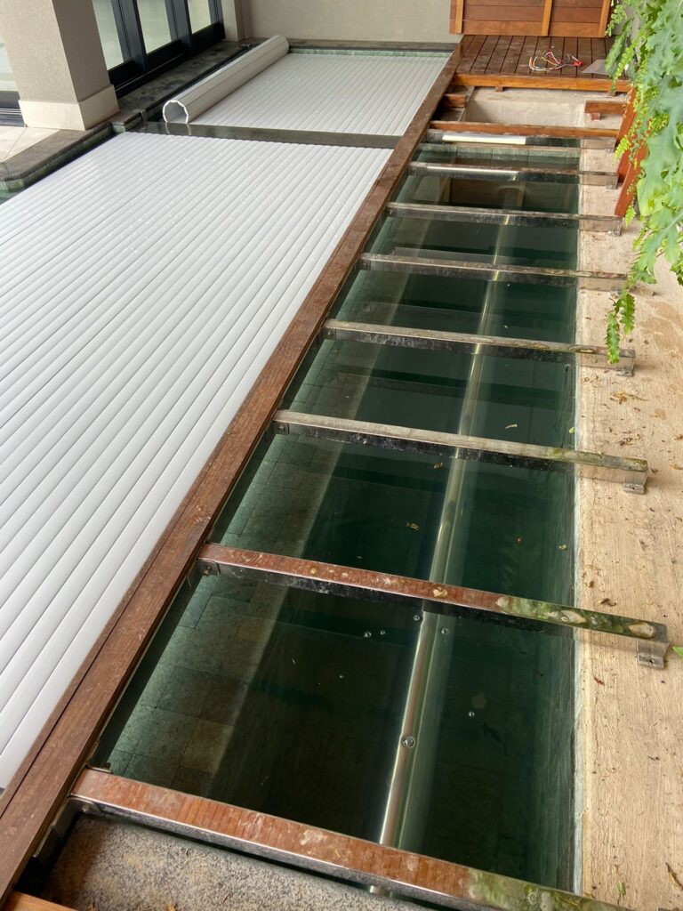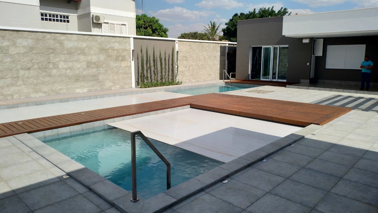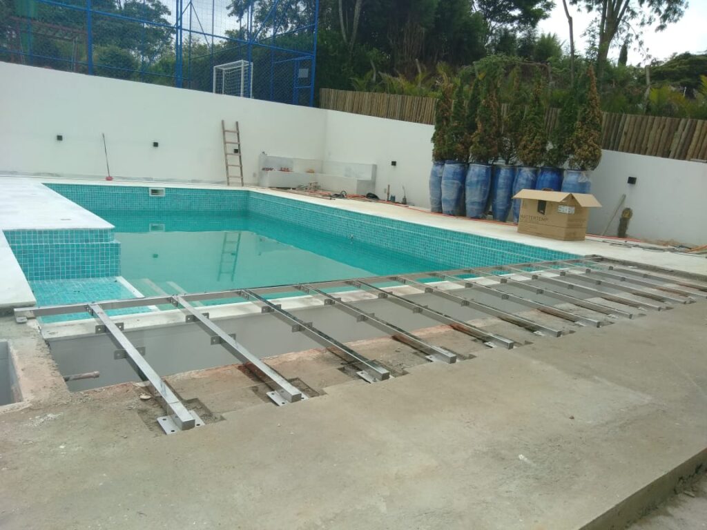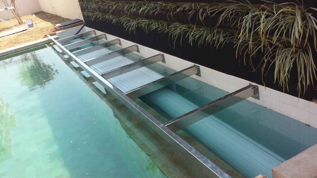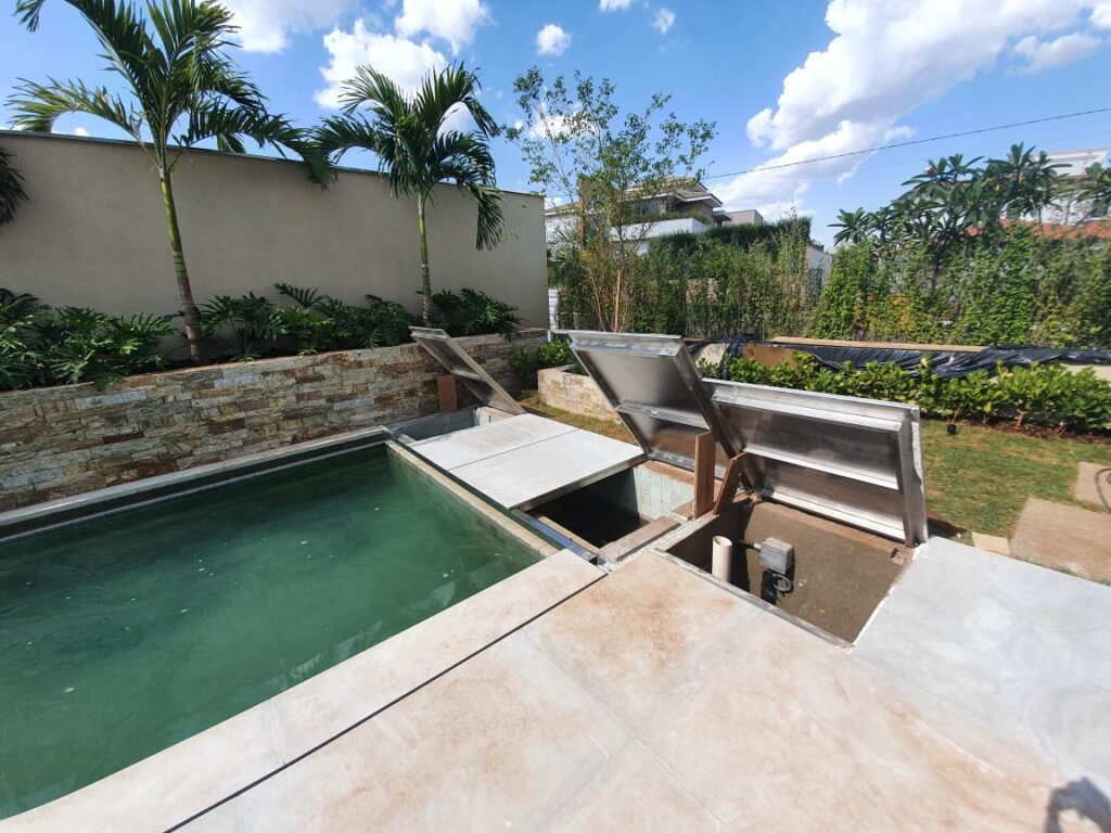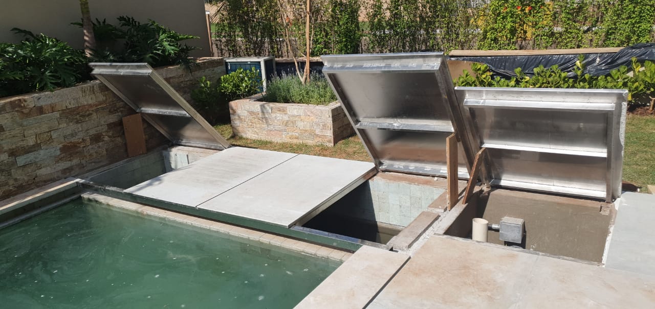 Alertamos que tanto a estrutura metálica que tem a função de suporte para as tampas, quanto as próprias tampas, não fazem parte do fornecimento da COBERPOOL devido as características técnicas do acabamento do entorno da piscina como: nível de acabamento das tampas, material a ser utilizado (madeira, cerâmica ou pedra) e também por questões de logística.