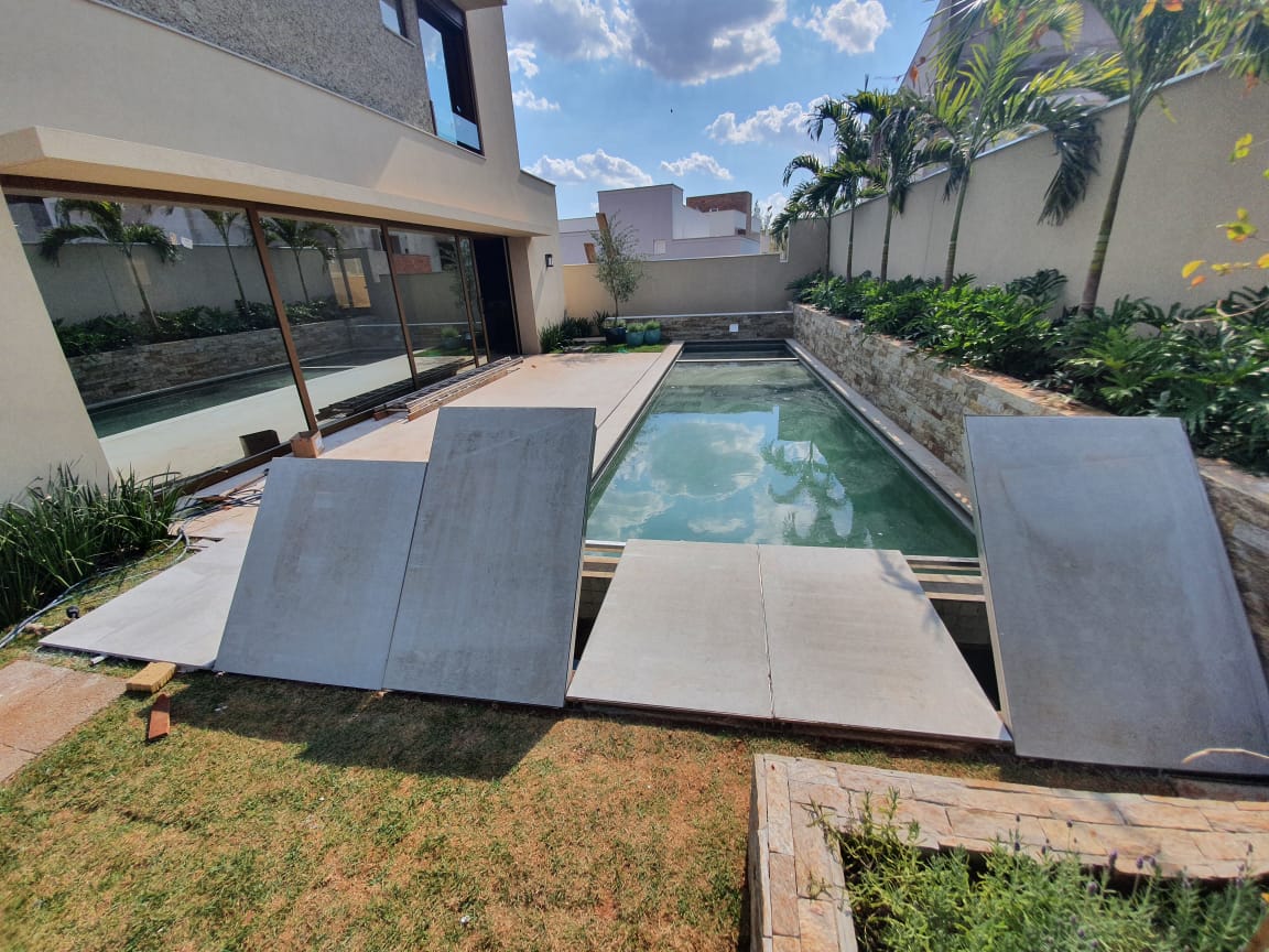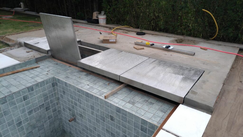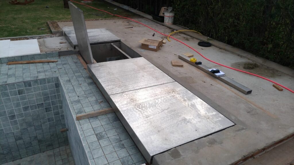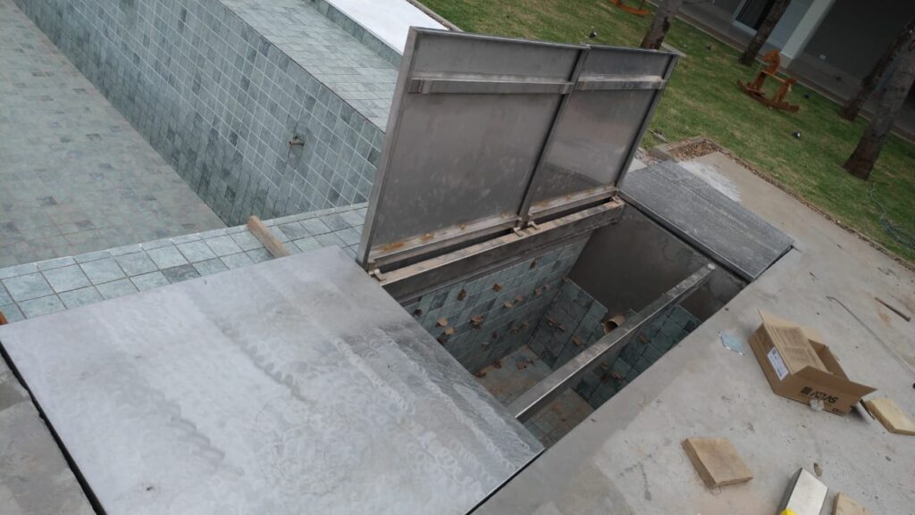 As tampas em pedra ou porcelanato também podem ser utilizadas para dar o acabamento sobre a caixa da capa e motor, porém requer uma estrutura metálica mais elaborada e reforçada para esses tipos de materiais. Sugerimos que em cima da estrutura metálica sejam previstas as bandejas para receber o material escolhido. Este tipo de sistema fica mais pesado para ser manuseado quando necessário.