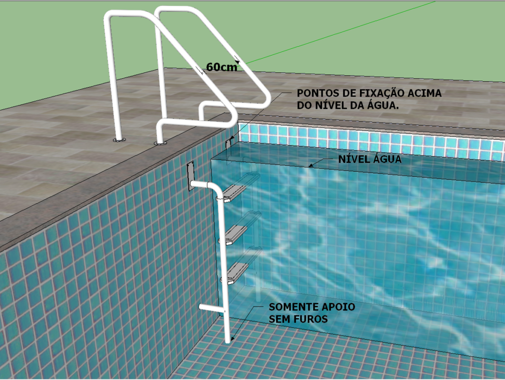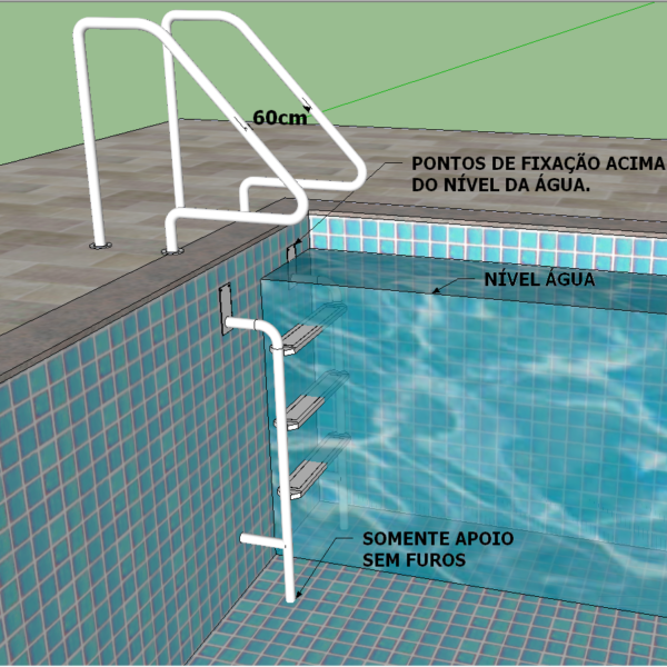 A base dos degraus é fixada na parede interna da piscina, acima do nível da água. Não há necessidade de realização de furos abaixo do nível da água.